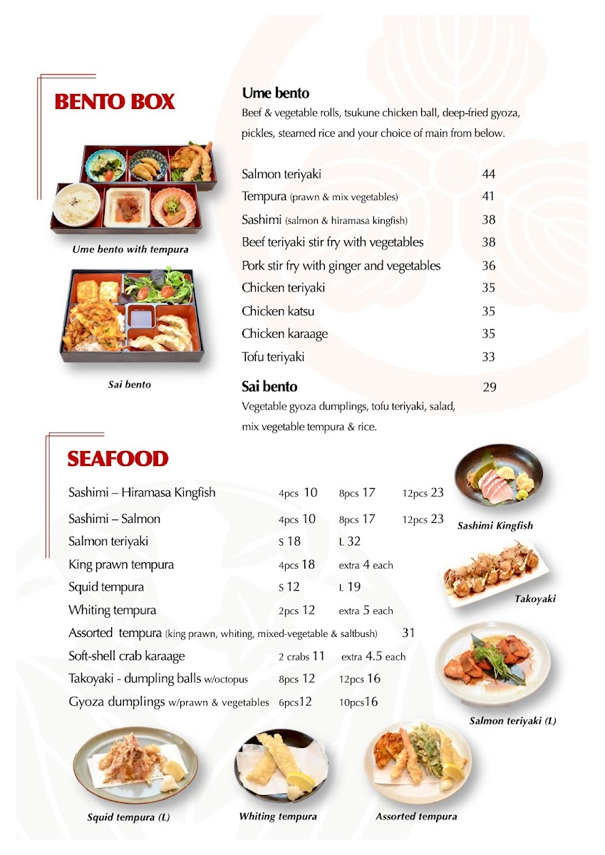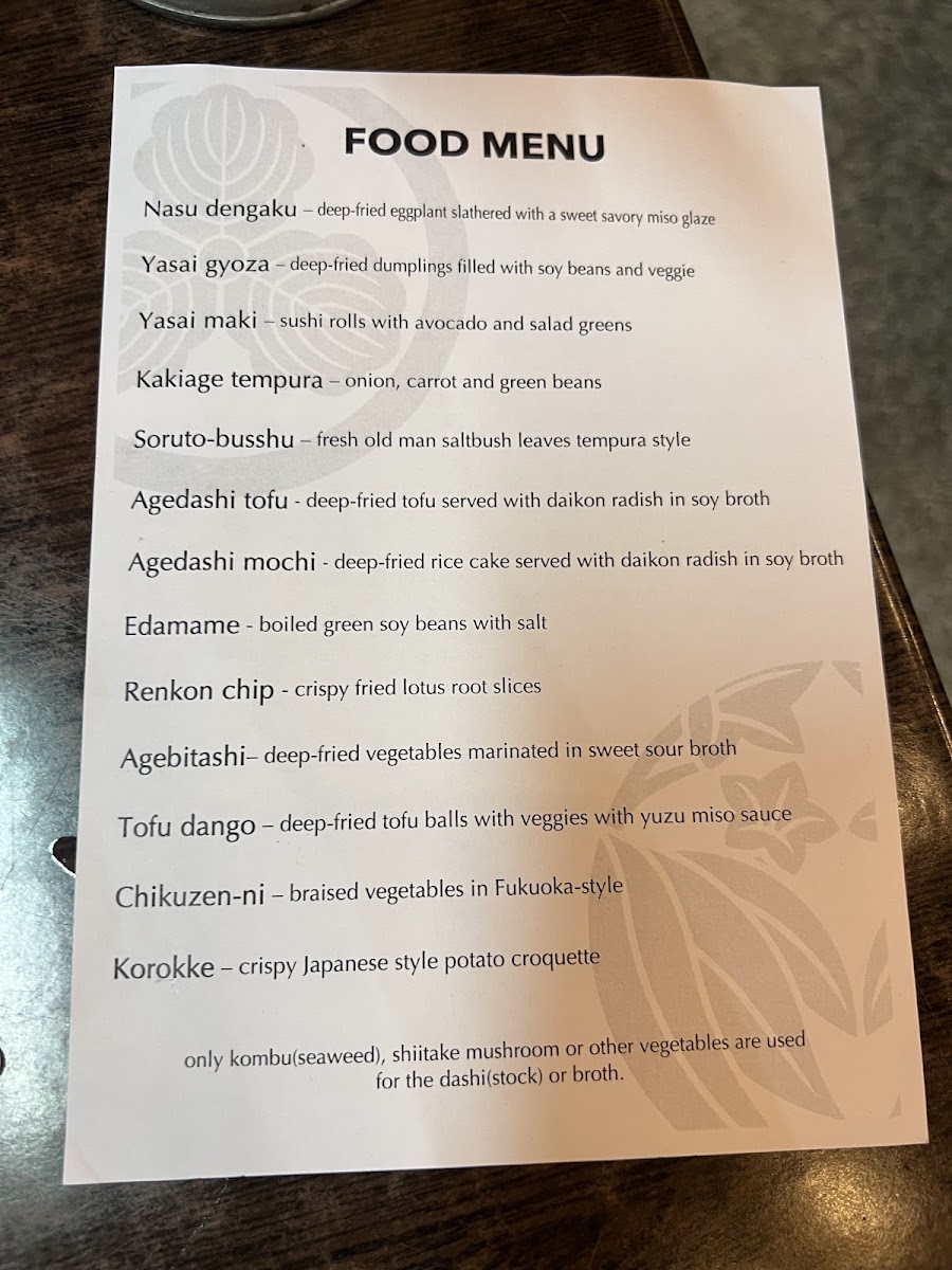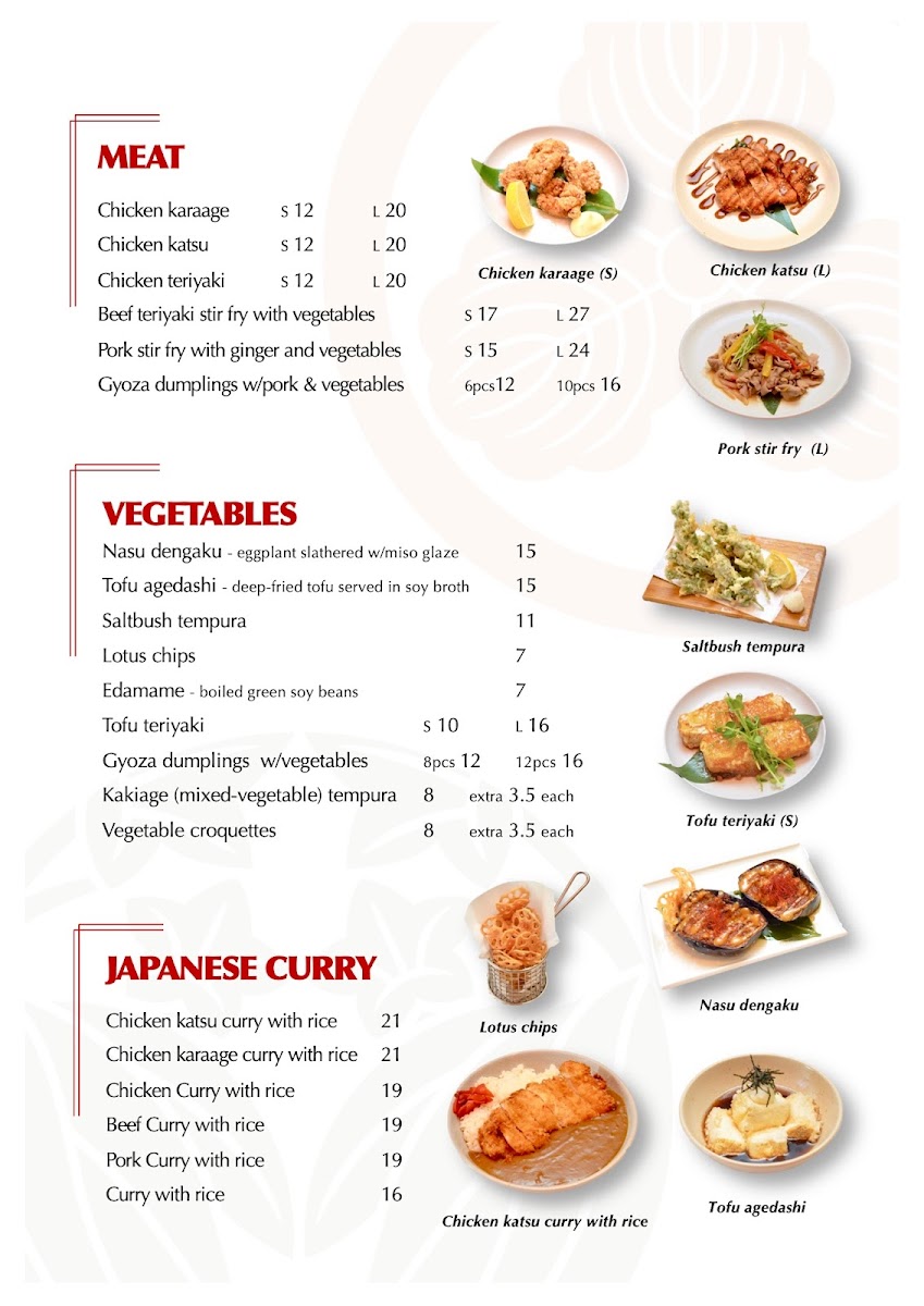 coming with vegetable gyoza dumpling, vegetable tempura, miso seasoned beans, Japanese omelette, potato salad, pickles, rice and your choice of main.